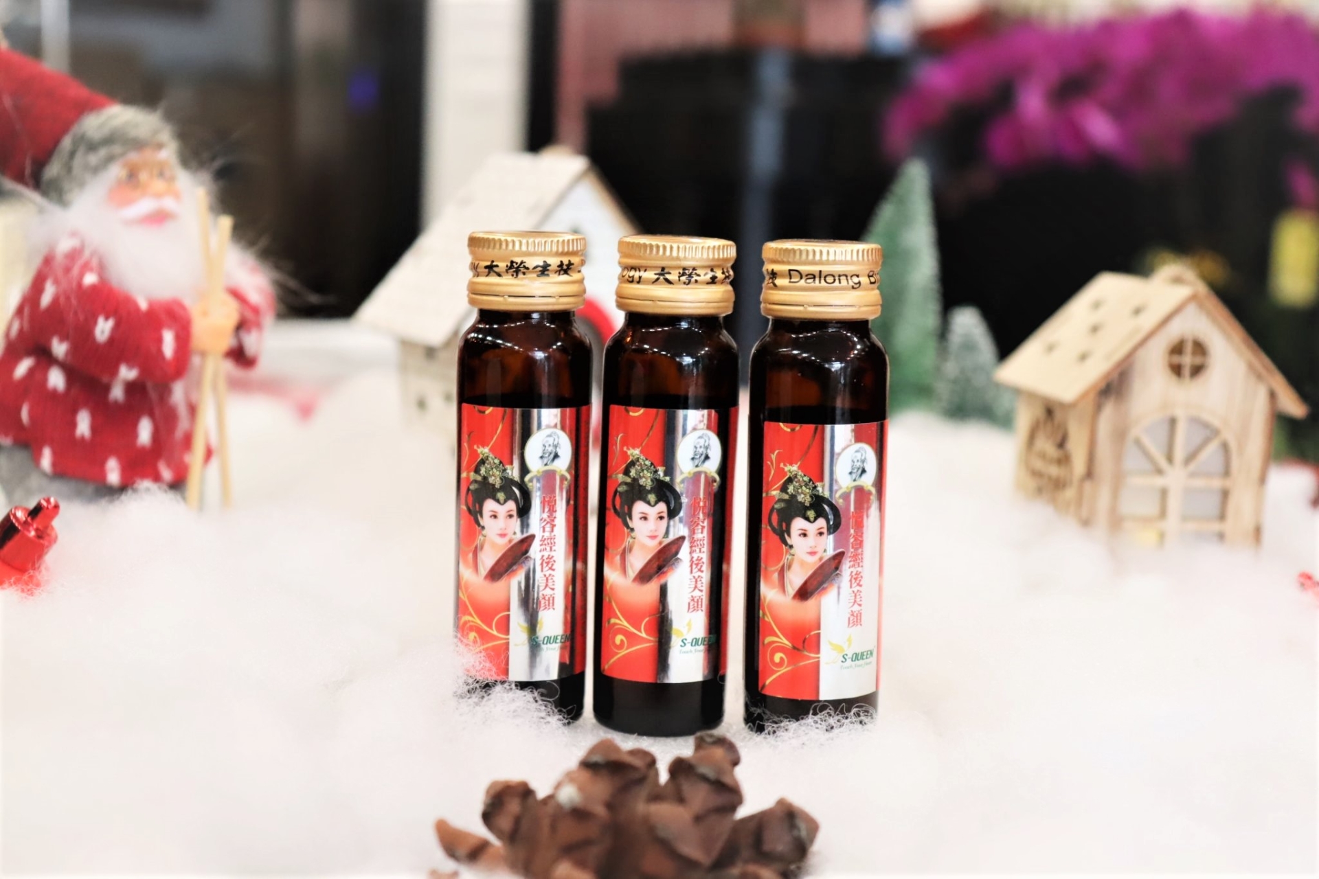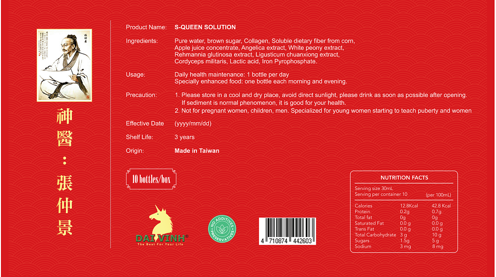 Collagen 1800 mg, chất xơ hòa tan từ ngô 1800 mg, nước táo cô đặc 1500 mg, chiết xuất hoa mẫu đơn trắng 480 mg, chiết xuất thục địa 480 mg, chiết xuất cam thảo 540 mg, chiết xuất Xuyên Khung 480 mg, nấm Đông trùng hạ thảo 150 mg, Axit lactic: 75 mg, Sắt Pyrophosphate 15 mg, nước 19200 mg, đường đen 3000 mg.